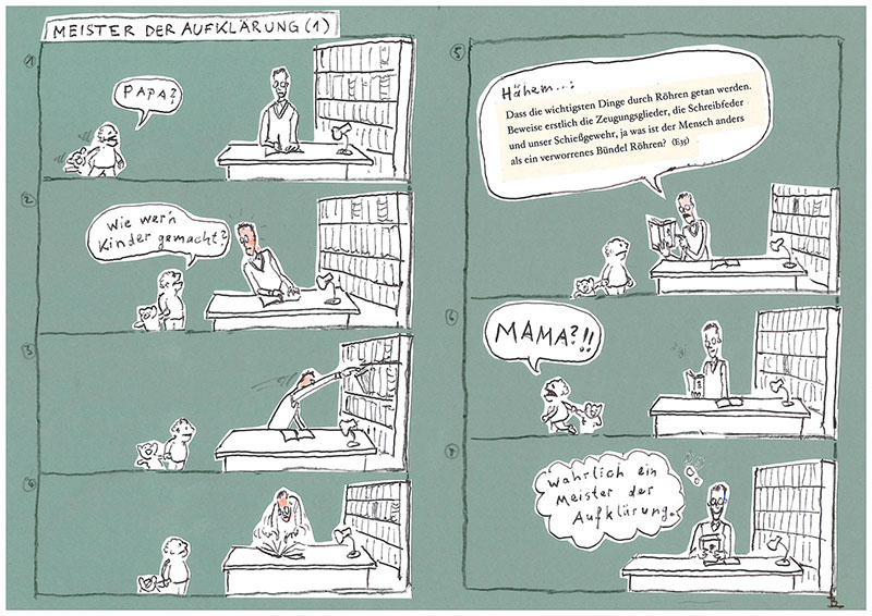 „Meister der Aufklärung (2)“, Tinte/Aquarell auf Papier und Karton, 21cm x 29,7 cm, 2014